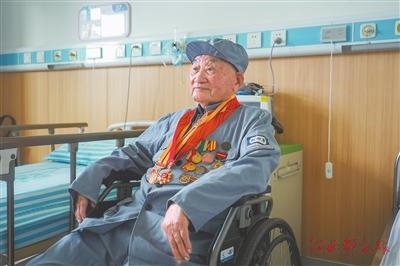 初秋時(shí)節(jié),中國(guó)人民解放軍聯(lián)勤保障部隊(duì)第908醫(yī)院的一間病房?jī)?nèi),99歲的新四軍老戰(zhàn)士尤云儒再次穿上他掛滿勛章的軍裝,陽(yáng)光透過窗戶灑在歷經(jīng)歲月洗禮的勛章上,折射出點(diǎn)點(diǎn)金光。這位17歲便加入抗日游擊隊(duì)奮勇殺敵的戰(zhàn)士,如今臉上布滿溝壑,顴骨高挺,笑容慈祥,但眼神中依然透露著堅(jiān)定與果敢。
