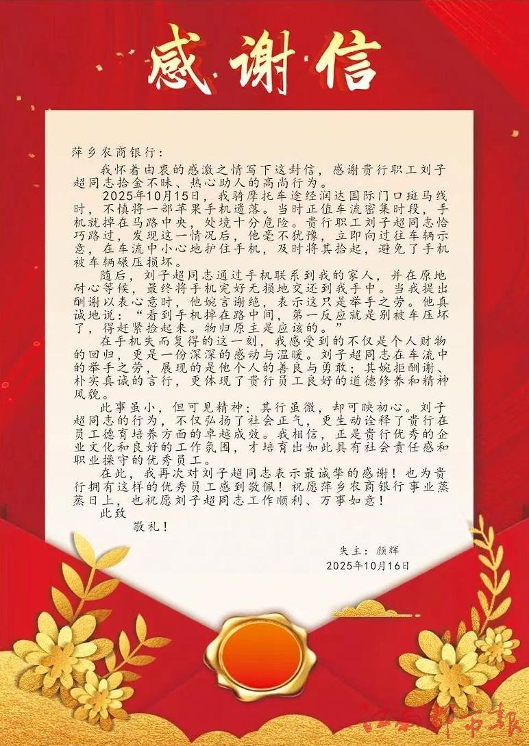 面對(duì)手機(jī)失而復(fù)得,顏輝激動(dòng)地表示:“我感受到的不僅是個(gè)人財(cái)物的回歸,更是一份深深的感動(dòng)與溫暖。劉子超在車(chē)流中的舉手之勞,展現(xiàn)的是他個(gè)人的善良與勇敢;其婉拒酬謝、樸實(shí)真誠(chéng)的言行,更體現(xiàn)了農(nóng)商銀行員工良好的道德修養(yǎng)和精神風(fēng)貌”。(劉子超 羅君)