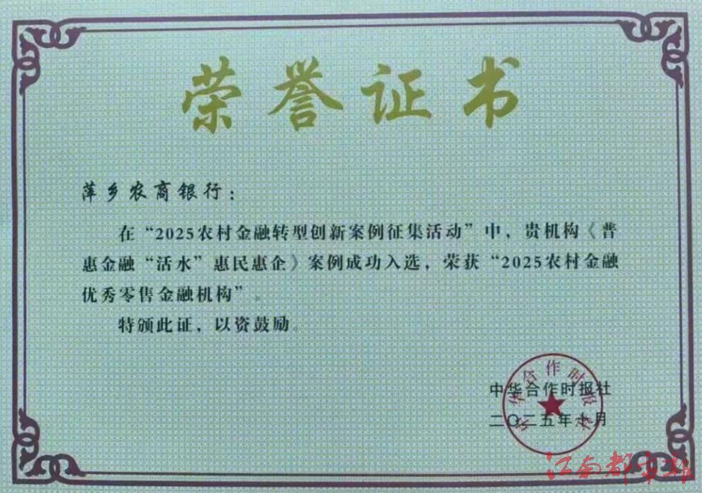 萍鄉(xiāng)農(nóng)商銀行榮獲2025農(nóng)村金融優(yōu)秀零售金融機(jī)構(gòu)